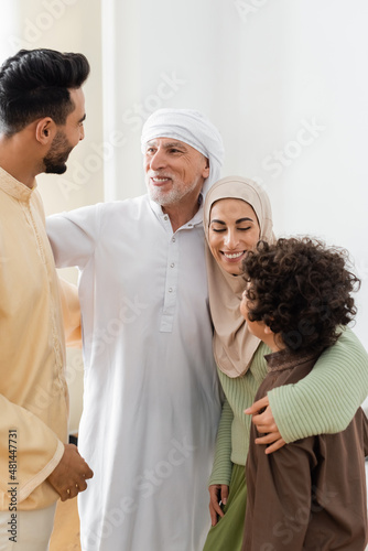 © LIGHTFIELD STUDIOS, Fototapeta premium interracial muslim family embracing while looking at each other at home.