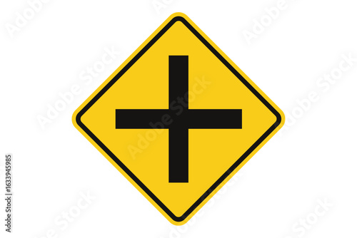© James, Fototapeta premium Intersection road sign, yellow diamond traffic warning symbol, crossroad ahead safety notice, black plus shape, transportation caution, vector illustration for driving and highway alerts