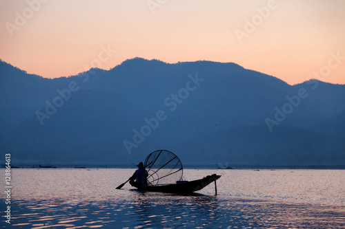 Naklejka premium Intha fisherman fishing at sunset in his typical canoe with fish