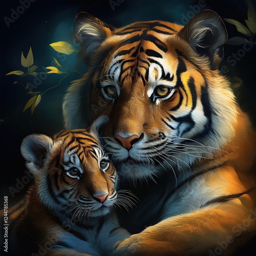 © netsay, Fototapeta premium Intimate Bond A tender Moment Shared by a Tigress and Her Cub in the Wild, Illuminated by the Golden Sunlight under Lush, Verdant Forest Canopy.