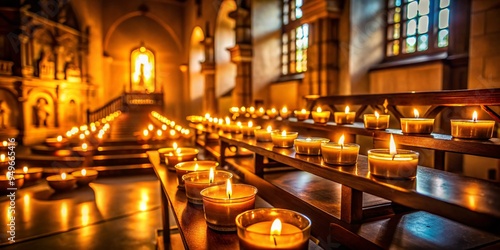 Fototapeta premium intimate candlelit prayer room soft focus warm golden glow gentle shadows...