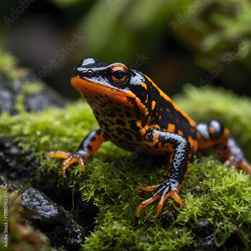 Obraz premium Intimate Close-Up of a Black-Spotted Newt on a Mossy Surface
