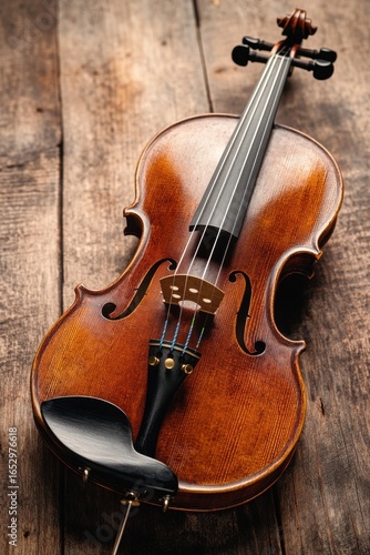 © Elzerl, Fototapeta premium Intimate close-up of a vintage violin on old wooden table. Soft shadows and dramatic lighting highlight its rich grain, evoking a broken violin's quiet history with desaturated memories.