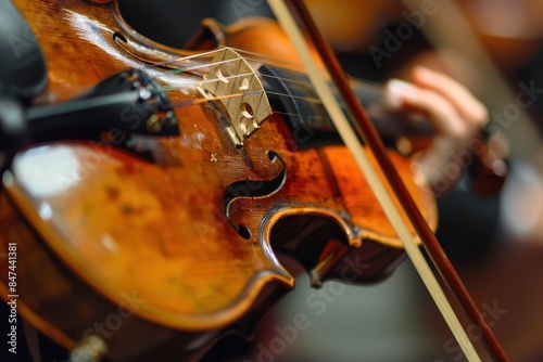 Fototapeta premium Intimate Close-Up of Violin Performance with Emphasis on Bow and Strings