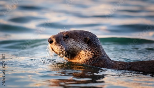 Obraz premium Intimate Encounter with a Playful Sea Otter Against a Picturesque Sunrise...