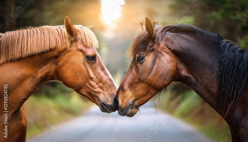 © netsay, Naklejka premium Intimate Moment Between Two Horses Stallion and Mare Nuzzling in a Forest Clearance on a Rural Road at Sunset, Capturing a Poignant Bond Filled with Respect and Affection.