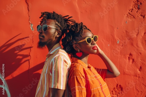 © Odin AI, Fototapeta premium Intimate moment of a couple closely posed with contrasting colorful outfits against a red wall