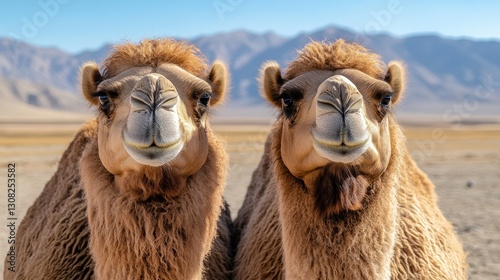 © AiPhotoSale, Obraz premium Intimate portrait of a camel with eyelids gently closed, soft focus on textured features, as its nose delicately curls under an open, serene gaze to the left