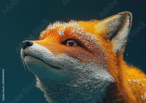 © Miramiska, Naklejka premium Intimate portrait of a fox's face, showcasing detailed fur texture and intricate patterns. The dark background emphasizes the subject's features.