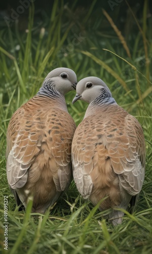 © Sucha, Fototapeta premium Intimate view of two European turtle doves amongst blades of grass, close up, eyes, plumage
