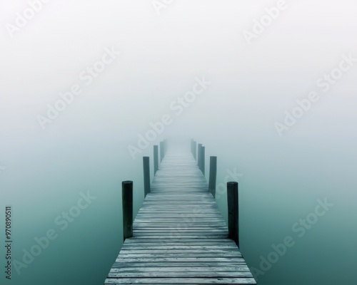 Fototapeta premium Into The Mist: A wooden pier disappears into a thick fog, a solitary path leading into the unknown. This minimalist image evokes a sense of mystery and contemplation, perfect for themes of anticipati