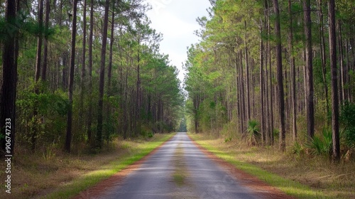 Fototapeta premium Into the Unknown: Scenic Road Vanishing Among Towering Pine Trees, Symbolizing Infinite Opportunities and Exploration