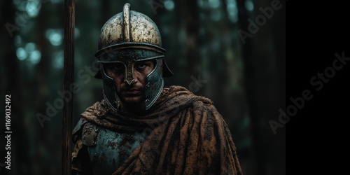 Naklejka premium Intrepid warrior in ancient armor stands resolute among shadows of a misty forest in twilight