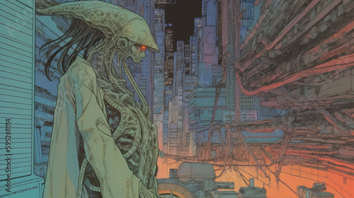 © CEVmemories, Obraz premium intricate alien cyberpunk landscape - by generative ai