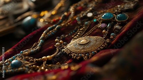 © wiwat apisithpinyo, Obraz premium Intricate Antique Jewelry Pieces with Colorful Gemstones and Metals