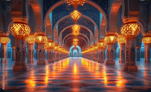Obraz premium Intricate Arches and Glowing Lanterns in a Serene, Colorful Corridor