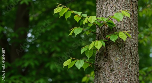 © meka, Obraz premium Intricate bark texture with fresh sprouts and vivid green leaves