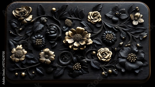 © Tiyur, Obraz premium Intricate Black And Gold Floral Carving On Wooden Box