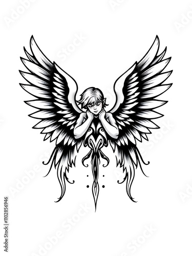 © heinng, Obraz premium Intricate Black and White Angel Illustration: A Seraph Design. AI Generated