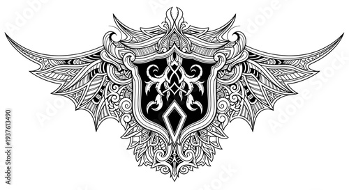 Naklejka premium Intricate black and white emblem with ornamental wings and shield design