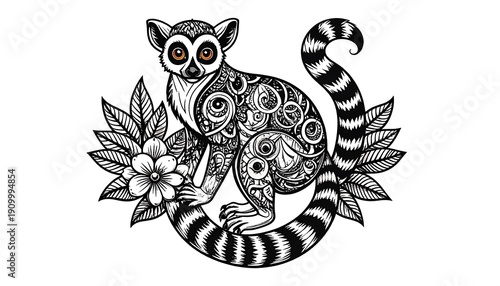 Fototapeta premium Intricate black and white illustration of a lemur with detailed patterns, perched on foliage