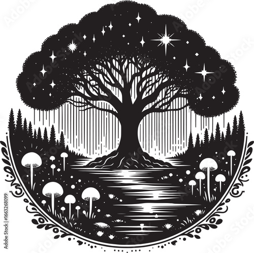 © Cici, Naklejka premium Intricate black and white illustration of a mystical tree with mushrooms and a starry sky
