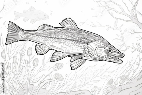 Fototapeta premium Intricate black and white sketch of a fish among underwater plants