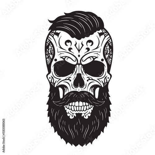 Fototapeta premium Intricate black and white skull illustration with beard and mustache tattoo design