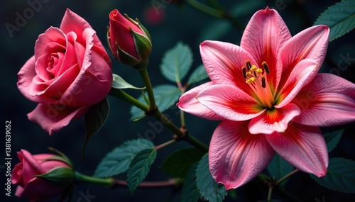 Fototapeta premium Intricate blooming roses & lilies, rich jewel tones , thread, art