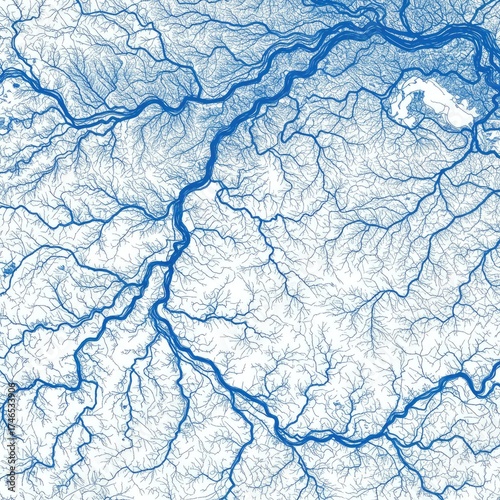 © JSR, Obraz premium Intricate Blue River Network System Topographical Map Abstract Pattern with Detailed Tributaries and Branching Waterways on a White Background ideal