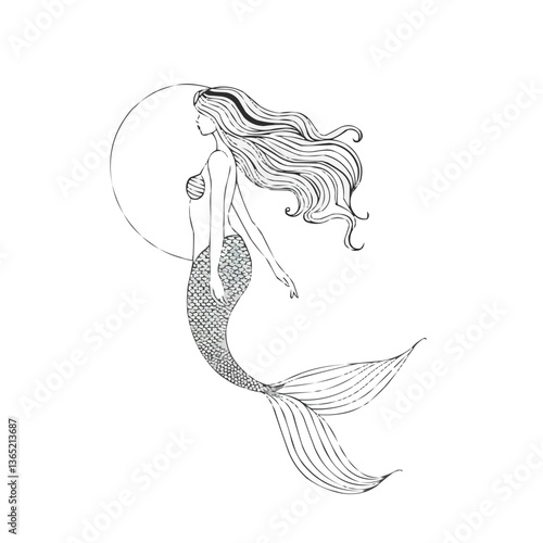 © Tania, Obraz premium Intricate blue waves with full moon in minimalist nautical art design.