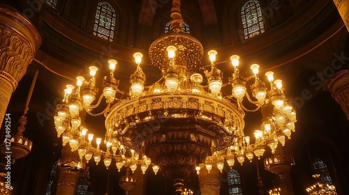 Obraz premium Intricate Chandelier with Warm Lighting in Historic Interior Space