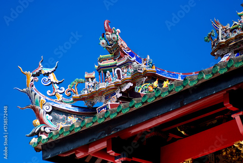 © Denise, Fototapeta premium Intricate Chinese Temple Roof Ornament with Colorful Figures and Mythical Creatures Against Blue Sky