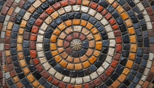 © Pungkas, Fototapeta premium intricate circular mosaic pattern featuring concentric rings of colorful textured tiles in earth