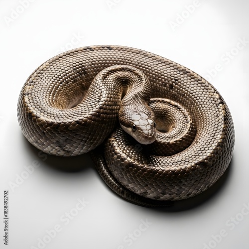 © imdad, Obraz premium Intricate close-up of a curled serpent with detailed scales, showcasing its reptilian beauty and the fascinating patterns of its skin, on a white surface