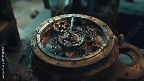 © kopel magelang, Fototapeta premium Intricate close-up of a vintage clock mechanism showcasing gears and springs in a dimly lit workshop