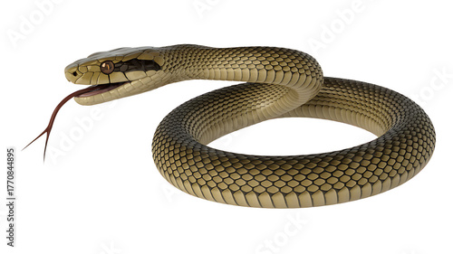 © MMaazgraphicx , Fototapeta premium Intricate coiled snake with forked tongue flicking, a symbol of danger, transformation, and primal power, ready to strike or shed old skin in a striking visual.