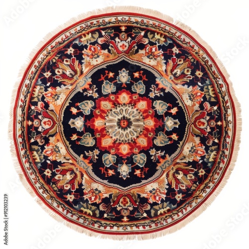 © MINMIN, Naklejka premium Intricate, colorful circular rug with floral and geometric patterns on a dark blue background.