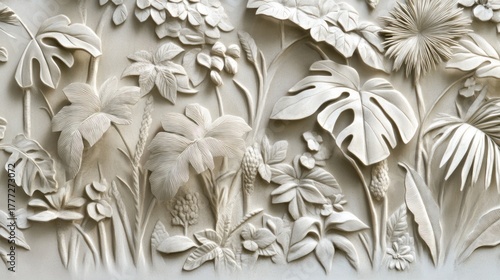 © Mufarokah, Fototapeta premium Intricate 3D floral relief wall art. Elegant, textured, off-white design