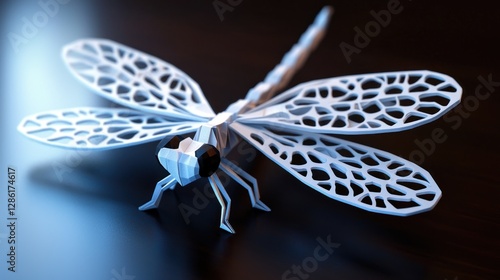 Fototapeta premium Intricate 3D-Rendered Dragonfly on a Dark Surface with Soft Lighting and Detailed Texture