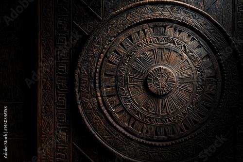 Naklejka premium Intricate, dark wood circular design with carved patterns. Detailed carvings, geometric shapes, and circular motifs create a visually rich panel