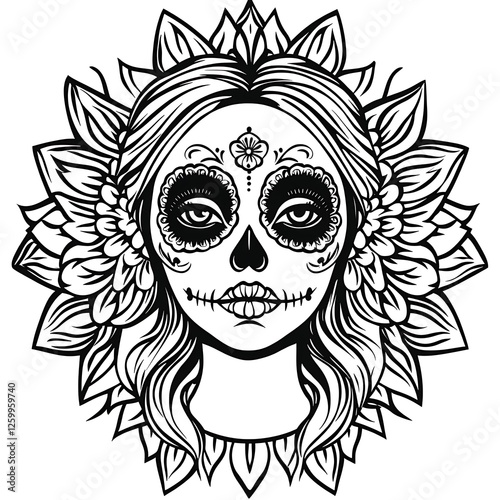 Fototapeta premium Intricate Day of the Dead Sugar Skull Woman with Flowers and Decorative Patterns