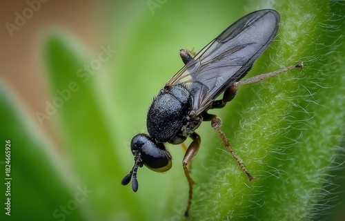 Fototapeta premium Intricate details of a black Simuliidae fly resting on a green leaf in a tranquil natural setting