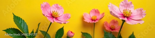 © chaiwat, Naklejka premium intricate details of pink flower texture and veins against a bright yellow background with lush green foliage, petals, foliage, detail