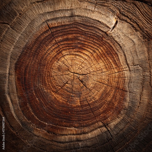 © Ouzhan, Naklejka premium Intricate details of wood annual rings showing texture and age. A close-up view of the wooden texture displays the tree's history and characteristics.