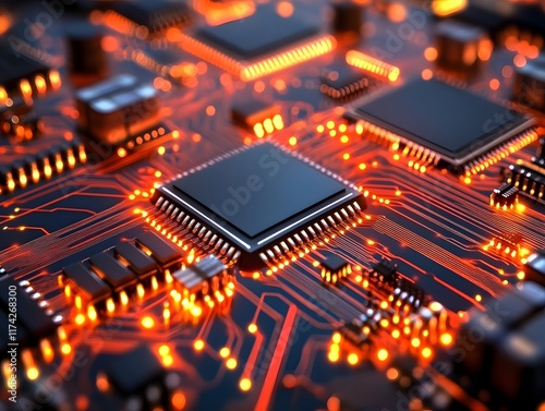 Fototapeta premium Intricate Digital Data Transfer on Advanced Circuit Board with Microchips