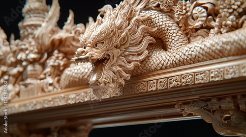 © TI3ee, Fototapeta premium Intricate Dragon Carving on Asian Shrine