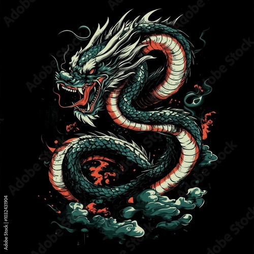 © Supithcha Mani, Obraz premium Intricate dragon illustration on black background