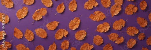 Fototapeta premium Intricate dry orange leaves, violet backdrop Geometric leaf arrangement,...