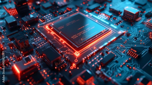 Obraz premium "Intricate electronic circuit board with glowing red and blue lights,...